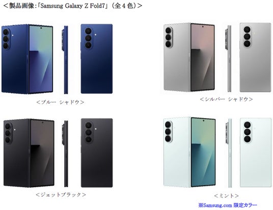 サムスン電子ジャパン株式会社はSamsung Galaxyのデザイン、カメラ、AI技術を結集した日本の横折りスマホ史上最薄・最軽量※の最新折りたたみスマートフォン「Samsung Galaxy Z Fold7」(SIMフリーモデル)および純正・専用アクセサリーを、本日2025年8月1日(金)より、Samsungオンラインショップ(https://www.samsung.com/jp/offer/)、Samsung Galaxyブランドショーケース「Galaxy Harajuku」(東京・原宿)、「Galaxy Studio Osaka」(大阪・なんば)にて販売を開始いたします。