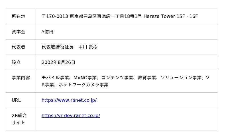 株式会社ラネットは、モバイル事業で培った通信事業を基盤に、VR事業、ネットワークカメラ事業、教育事業といった成長分野へ事業を拡大しています。特にVR事業では、総合サイト「XR総合ソリューションサイト」を通じてXR技術がもたらす豊かな社会の実現に貢献します。