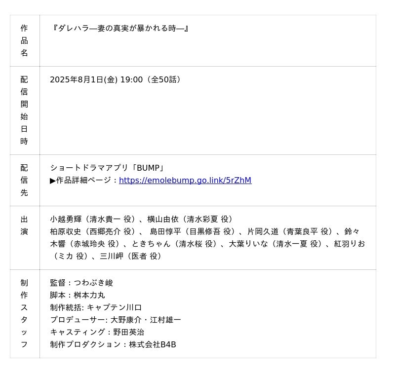 縦型ショートドラマの企画プロデュース・キャスティング・制作・PRまでをワンストップで手がける株式会社B4B(ビーフォービー、本社:東京都千代田区、代表取締役:大野 康介、以下B4B)によるショートドラマ『ダレハラ―妻の真実が暴かれる時―』が、累計230万ダウンロードを突破したショートドラマアプリ「BUMP」にて、2025年8月1日(金)19:00 より独占配信されます。