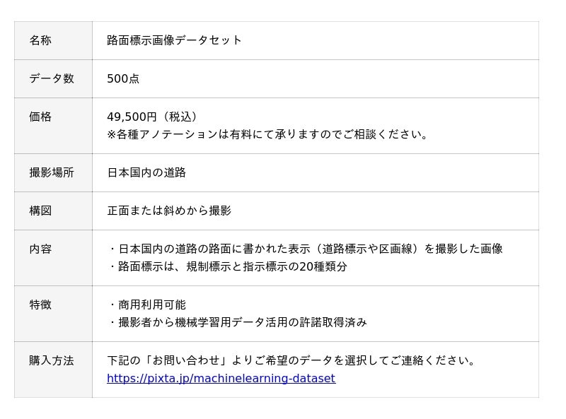 そこで、PIXTAでは豊富な日本の画像を取り扱うという強みを活かし、2025年5月に「道路標示データセット」の販売を開始したところ、AI開発に取り組む企業からお問い合わせをいただくなど反響がありました。そのことをうけ、今回は、路面に書かれた標示画像をデータセットにして提供することにいたしました。