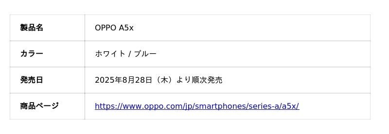 革新的なデザインとテクノロジーで業界をリードするスマートデバイスブランドOPPOは、「OPPO Aシリーズ」の最新機種である「OPPO A5x」(オッポ エーファイブエックス)を一部の販売チャネルにて8月28日(木)より順次販売を開始します。
