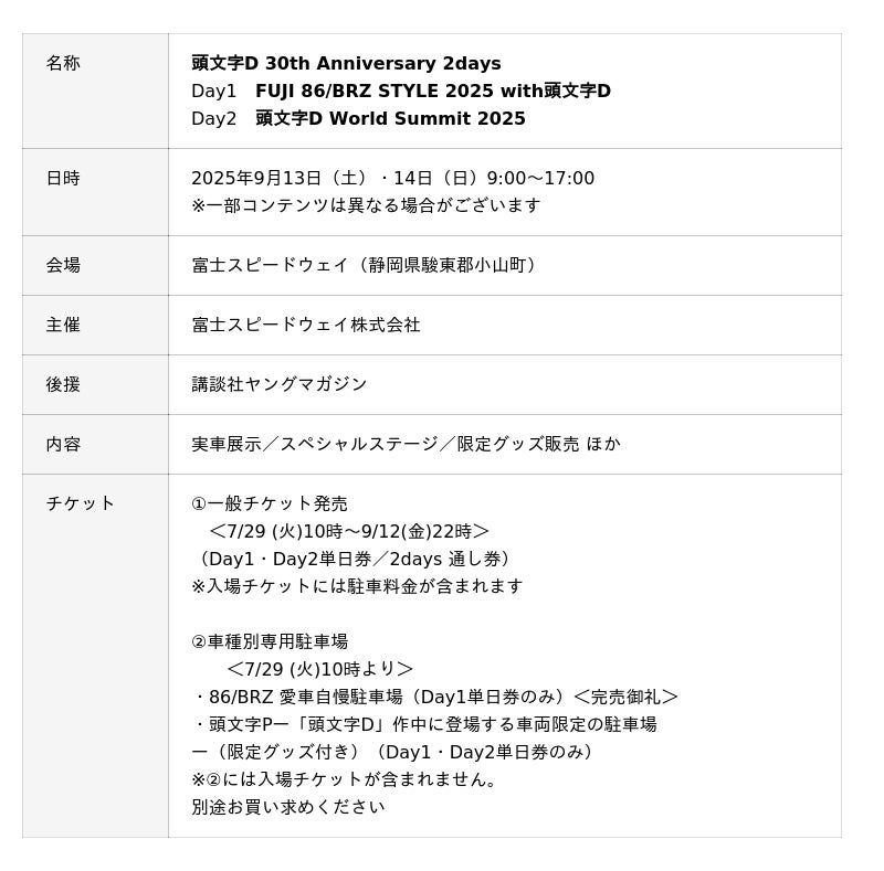 “FUJI 86/BRZ STYLE 2025 with 頭文字D”今年は「頭文字D 30th Anniversary 2days」として開催