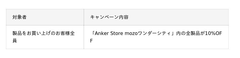 今回、オープン記念キャンペーンとして、2025年9月5日(金)〜 2025年9月15日(月・祝)の11日間限定で「Anker Store mozoワンダーシティ」内の全製品を10%OFFでご購入いただけます。