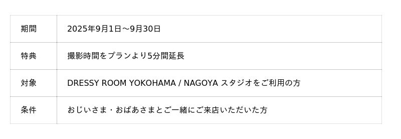 セルフ写真館 PICmiiは、カメラ専門店「カメラのキタムラ」のグループ会社として、撮影画質の仕上がりにこだわったセルフ写真館で、個室での自由な撮影をお楽しみいただけます。DRESSY ROOM YOKOHAMA/NAGOYAスタジオでは、9月限定で『敬老の日キャンペーン』を実施。9月15日は敬老の日。 日頃の感謝を込めて、おじいさま・おばあさまとご一緒にご来店いただいた方は、撮影時間をプランより5分間延長してご案内いたします。ご家族そろって、あたたかな時間を写真に残していただけますように。 笑顔あふれるひとときをお楽しみください。※ご予約時またはご来店時に「キャンペーンの記事を見た」とお伝えください。