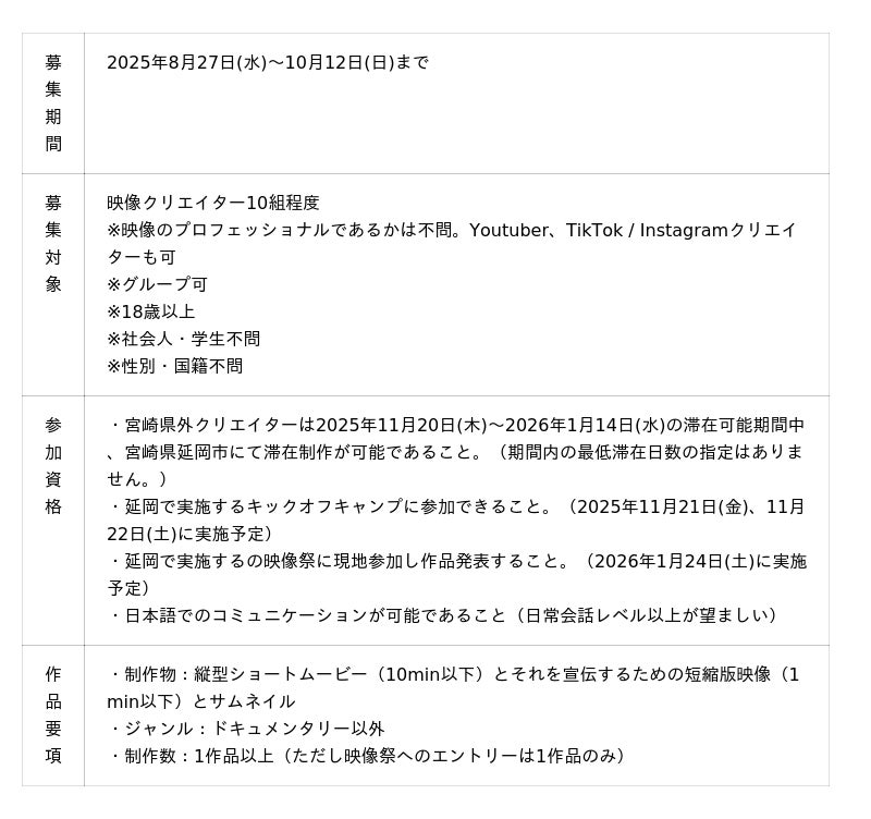 3回目となる「コネクリ延岡2025」では、映像クリエイターは延岡市で最大20日間の滞在型映像制作を行い、縦型ショートムービーの制作へ挑戦することができます。制作期間で制作された映像作品は、市民参加で作り上げる映像祭で上映されます。