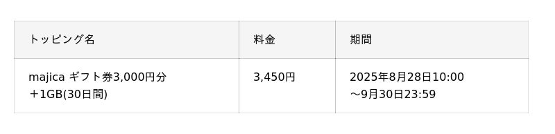 KDDI、沖縄セルラーは2025年8月28日から9月30日まで、povo2.0の期間限定トッピングとして、総合ディスカウントストア「ドン・キホーテ」で利用できる「majica ギフト券3,000円分」と、「1GB(30日間)」をセットにしたトッピングを3,450円で提供します。