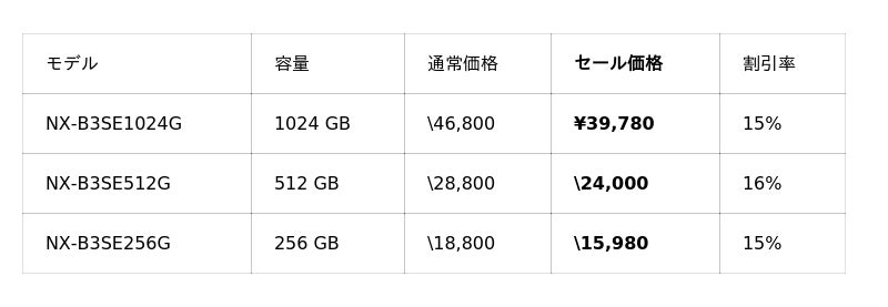 今回のセールでは、CFexpress 4.0 Type Bメモリーカード「NX-B3SEシリーズ」や、CFexpress 4.0 Type Aメモリーカード「NX-A2SEシリーズ」がお求めやすい価格となっております。両シリーズとも静止画から4K/8Kなどの高画質動画撮影までマルチにお使いいただくことができるメモリーカードです。