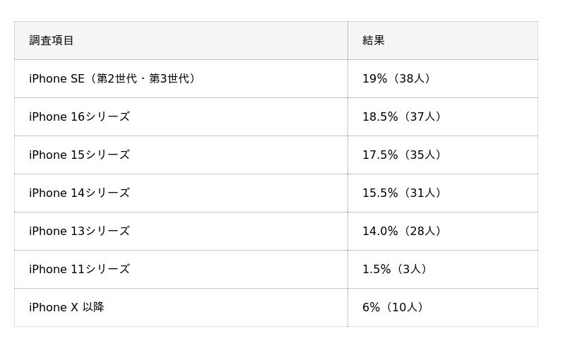 今回の調査では、最も利用者が多いシリーズは「iPhone SEシリーズ」(19%) という結果となりました。最新の16シリーズ(18%)や15シリーズ(17%)を上回り、SEシリーズの根強い人気が明らかになっています。