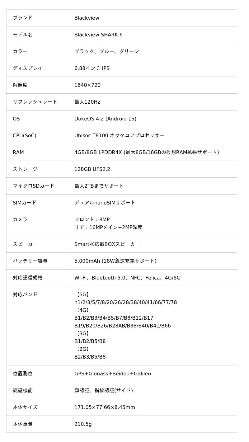 Blackview Shark 6のスペック&仕様