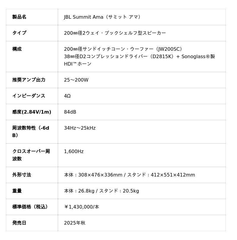 ハーマンインターナショナル株式会社(本社:東京都千代田区、代表取締役:桑原拓磨)は、アメリカ カリフォルニア発祥の世界最大級のオーディオブランドであり、日本においてワイヤレススピーカー7年連続販売台数No.1※1に輝く「JBL」より、200mm径2ウェイ・ブックシェルフ型スピーカー「JBL Summit Ama(ジェイビーエル サミット アマ)」を2025年秋より発売いたします。