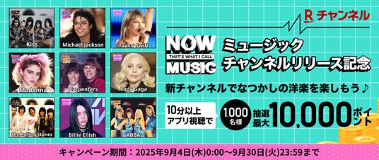 ・キャンペーン内容: 対象期間中にエントリーのうえ、「Rチャンネル」スマートフォンアプリ内で楽天IDログイン後に対象の音楽チャンネル「NOW 70s」「NOW 80s」「NOW 90s00s」「NOW ROCK」をアプリで10分以上視聴した方の中から抽選で1,000名に「楽天ポイント」最大10,000ポイントを進呈