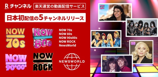 楽天グループ株式会社が運営する、無料のリニア型動画配信サービス「Rチャンネル」は、香港のLightning International (Media) Limited(以下「Lightning International社」)が提供する、1970年代から2000年代のヒット曲やロックの名曲をジャンル・年代別に楽しめる「NOW 70s」「NOW 80s」「NOW 90s00s」「NOW ROCK」の4つの「NOW」ミュージックシリーズと、世界の主要グローバルニュースを24時間ノンストップで配信するライブニュースチャンネル「NewsWorld」の5チャンネルを開設しました(注1)。なお、これらのチャンネルは日本初配信となります。