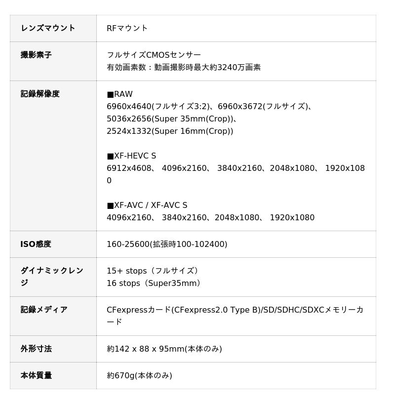 - CINEMA EOS初、センサー全面を活用するオープンゲート記録- 7K 60P内蔵RAW記録・オーバーサンプリング4K動画記録