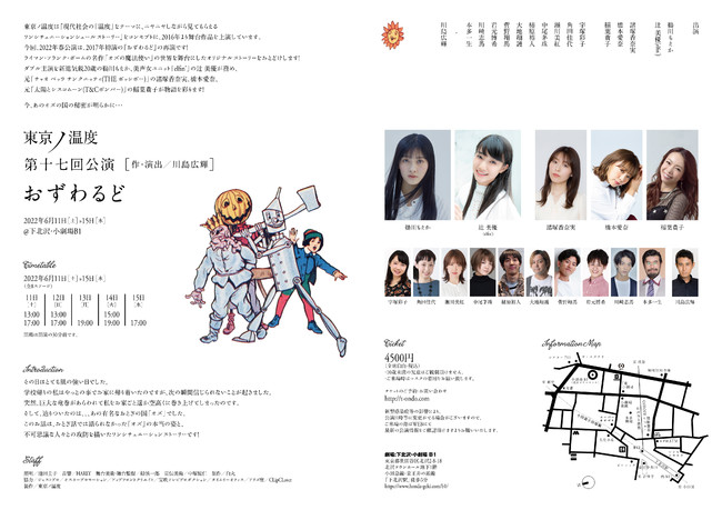 演劇ユニット「東京ノ温度」(2016年設立 代表・川島広輝)は2022年6月11日(土)〜15日(水)下北沢・小劇場B1に於いて第十七回公演『おずわるど』を上演致します。 本作は2017年初演公演の再演となります。ライマン・フランク・ボームの名作「オズの魔法使い」をモチーフに現代の社会問題を絡ませた、疾走感溢れるコメディテイストの作品です。 昨年上演した東京ノ温度初の再演公演「ありすとてれす」では、一村すみれ(ジャストプロ)、須藤茉麻(Berryz工房/ジェイピールーム) 、小倉舞子(elfin'/オスカープロモーション)等がメインキャストを務め好評を博しました。 本作は再演公演の第2弾となり、新進気鋭20歳の鵜川もえか(ジャストプロ)と、美声女ユニット「elfin'」の辻 美優(オスカープロモーション)がW主演を務めます。 共演には元「チャオ ベッラ チンクエッティ(THEポッシボー)」の諸塚香奈実と橋本愛奈。また元「太陽とシスコムーン(T&Cボンバー)」の稲葉貴子が物語のキーパーソンとして出演致します。 全公演のweb有料配信も予定しています。