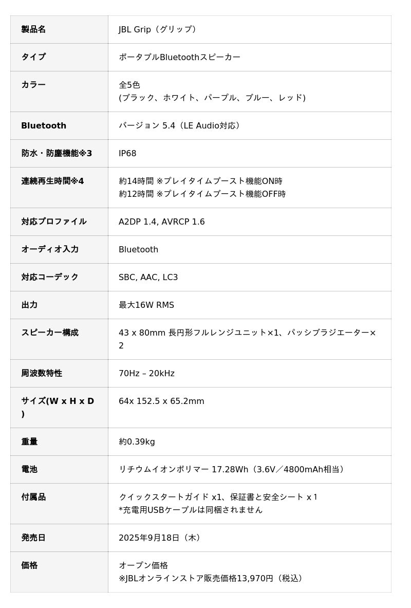 ハーマンインターナショナル株式会社(本社:東京都千代田区、代表取締役:桑原拓磨)は、アメリカ カリフォルニア発祥の世界最大級のオーディオブランドであり、日本においてワイヤレススピーカー7年連続販売台数No.1※1に輝く「JBL」より、大人気シリーズのポータブルBluetoothスピーカーに新しくラインアップされる「JBL Grip(グリップ)」を2025年9月18日(木)より発売いたします。