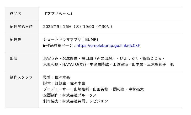 動画マーケティングのコンサルティングを行う、株式会社プルークス(本社:東京都中央区、代表取締役社長:丸山 博幸)は、課金型オリジナルショートドラマ『アプリちゃん (全30話)』を制作しました。制作した作品は、累計250万ダウンロードを突破したショートドラマアプリ「BUMP」にて、2025年9月16日(火)19:00 より独占配信します。