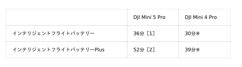 [1]機体の障害物回避アクションを[停止]に設定し、写真モードで、低電圧による強制着陸が発生するまで無風状態の海抜0mの高度を定速21.6km/hで前方に飛行させて測定した値です。データはあくまで参考用です。飛行中はアプリに表示されるリマインダーに常に注意を払ってください。