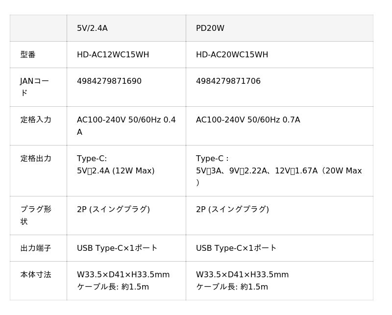 5V/2.4AとPD20W、お使いの機器に合わせて選べる2機種をご用意しました。