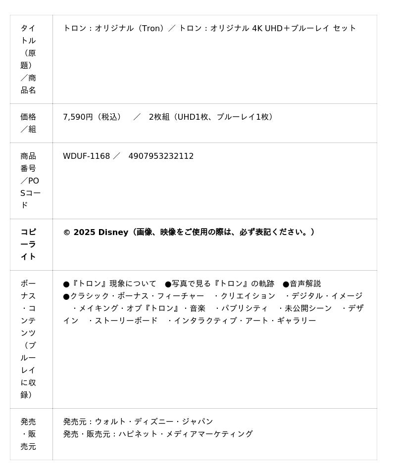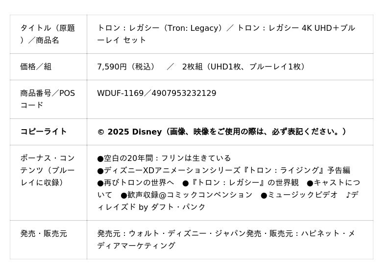10月10日(金)にはシリーズ待望の最新作『トロン:アレス』がいよいよ劇場公開!この公開を記念して、SF界の歴史的超大作2作が、この冬4K UHDで新登場します。この機会にぜひ『トロン:オリジナル 4K UHD+ブルーレイ セット』、『トロン:レガシー 4K UHD+ブルーレイ セット』をお楽しみください!