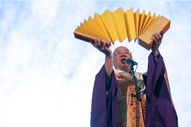 藤原栄善:「1200年の歴史ある高野山に伝わる仏教音楽 声明。今まで誰も考えつかなかったであろう電子音楽と声明のコラボレーション。天才音楽家 渋谷慶一郎氏によって幻想的な世界が創り出される。宇宙空間にいるような初めての体験。まさに曼荼羅世界。安心と心地よさを味わうことができる作品だと思います。」