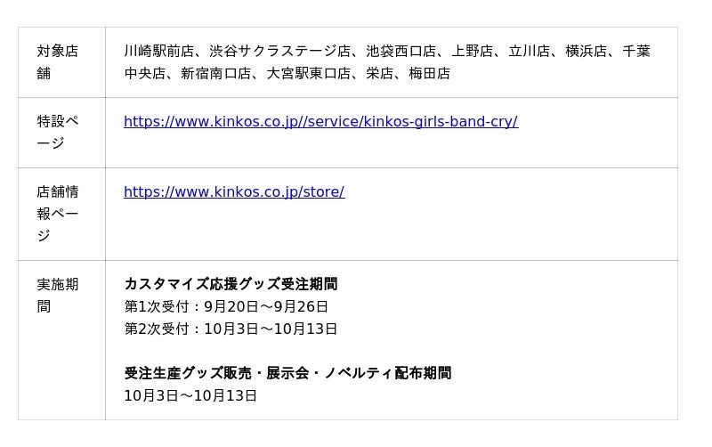キンコーズ・ジャパン株式会社(本社:東京都港区、代表取締役社長:渡辺 浩基、以下 キンコーズ)は、『劇場版総集編 ガールズバンドクライ 【前編】 青春狂走曲』の10月3日(金)公開を記念し、期間限定で上映映画館近隣に立地するキンコーズ店舗(対象店舗:川崎駅前店、渋谷サクラステージ店、池袋西口店、上野店、立川店、横浜店、千葉中央店、新宿南口店、大宮駅東口店、栄店、梅田店)にて、コラボ企画を実施いたします。