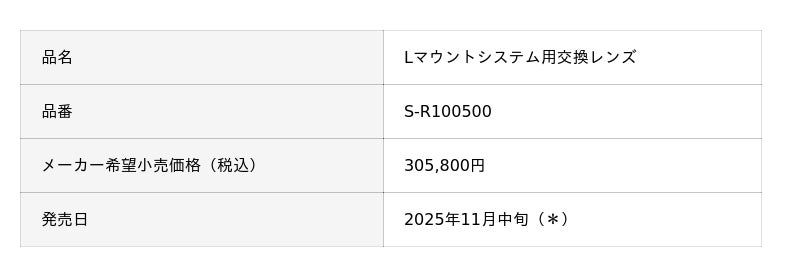 パナソニック株式会社(以下、パナソニック)は、フルサイズミラーレス一眼カメラ Lマウントシステム用交換レンズ S-R100500を2025年11月中旬(*)より発売します。