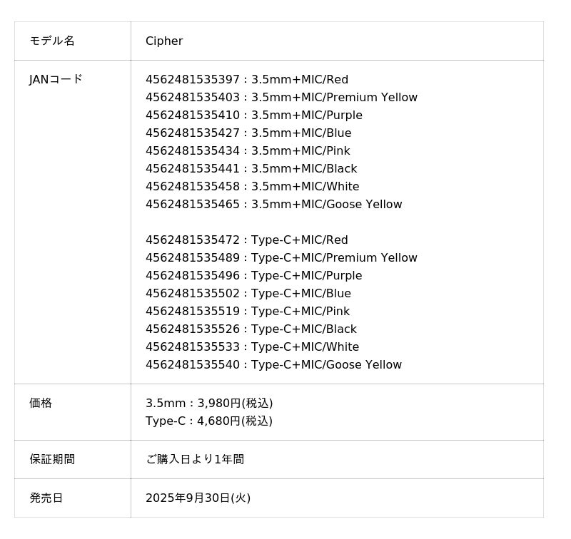 株式会社伊藤屋国際は、中国・深?で設立されたHi-Fiオーディオブランド、EarAcoustic Audio(イヤーアコースティックオーディオ)と中国の新星シンガーソングライターであるzkaaai氏とのコラボモデルイヤホン"Cipher"を9月30日(火)より販売開始いたします。
