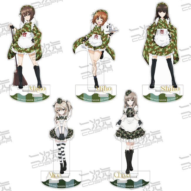 ミリタリー風のメイド服を身にまとった「西住みほ」「西住まほ」「西住しほ」「島田愛里寿」「島田千代」の描き下ろしイラストを使用したグッズが登場。