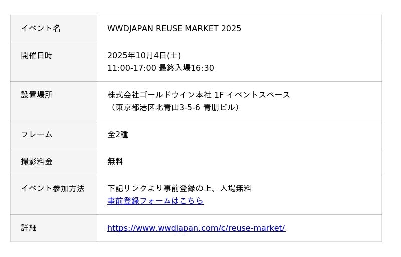 キタムラ・ホールディングス グループのピックハイブ株式会社(本社:東京都新宿区、代表取締役社長 兼 COO:大迫 由典)が運営するセルフフォトブランド「Photomatic」は、10月4日(土)に開催されるファッション&ビューティ業界メディア「WWDJAPAN」の、サステナブルな社会実現に向けたカルチャー体験型イベント「WWDJAPAN REUSE MARKET 2025」にセルフフォトブースを設置します。