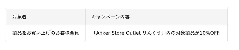 この度オープンを記念し、2025年10月10日(金)〜 2025年10月19日(日)の10日間限定で「Anker Store Outlet りんくう」内の対象製品を10%OFFでご購入いただけるキャンペーンを実施します。