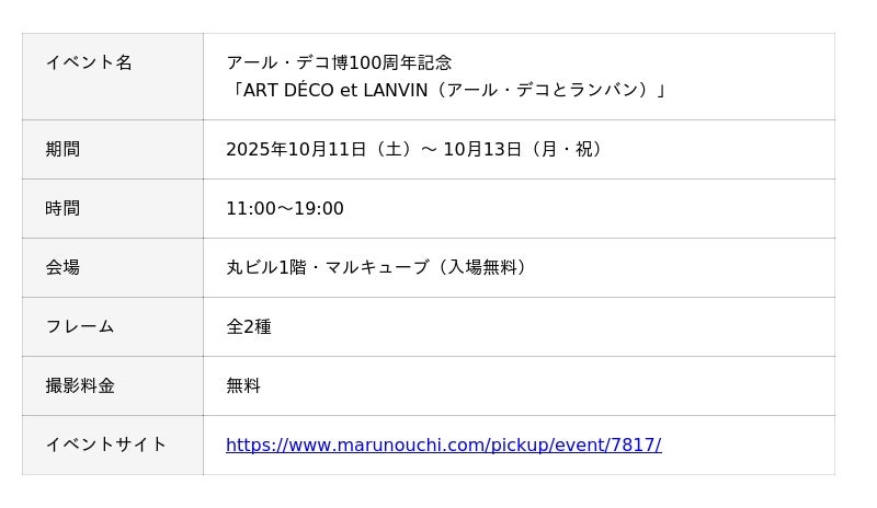 キタムラ・ホールディングス グループのピックハイブ株式会社(本社:東京都新宿区、代表取締役社長 兼 COO:大迫 由典)が運営するセルフフォトブランド「Photomatic」は、2025年10月11日(土)〜10月13日(月・祝)の3日間、東京・丸の内にある丸ビル1F・マルキューブで開催される「ART DECO et LANVIN(アール・デコとランバン)」に、イベントオリジナルフレームで撮影できるフォトブースを設置します。