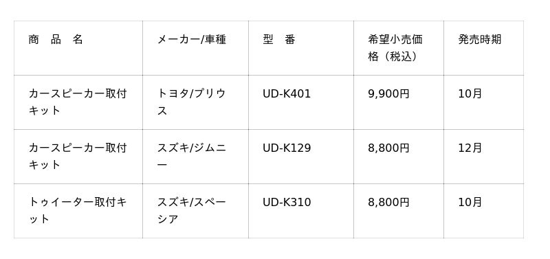 プリウス専用・ジムニー専用スピーカー取付キットと、スペーシア専用トゥイーター取付キットを発売