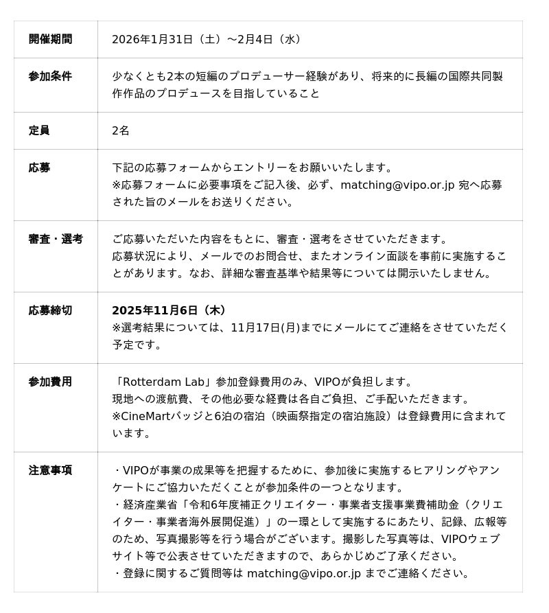 特定非営利活動法人映像産業振興機構(略称:VIPO[ヴィーポ]、理事長:松谷孝征、東京都中央区)は、「令和6年度補正クリエイター・事業者支援事業費補助金(クリエイター・事業者海外展開促進)」の一環として、2026年1月31日〜2月4日に、オランダのロッテルダムで開催される「Rotterdam Lab」(プロデューサー養成ラボ)に派遣する若手映画プロデューサーを募集いたします。