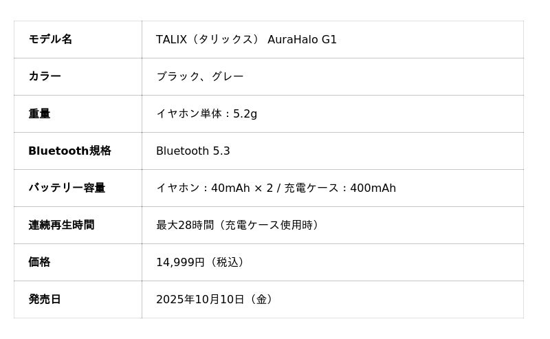 株式会社HHO(本社:中国浙江省杭州市、日本支社:東京都杉並区下高井戸)は、Lenovoグループの技術提供を受けるスマートデバイスブランド「TALIX(タリックス)」より、ビジネスおよびアウトドア環境での通話品質を追求したオープンイヤー型Bluetoothイヤホン「AuraHalo G1」を2025年10月10日(金)に発売いたします。