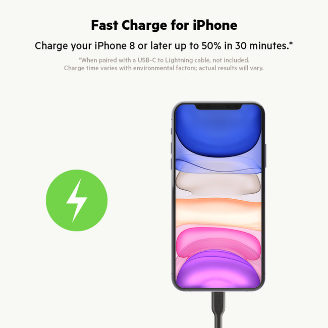 iPhone 8以降を30分で最大50%、Google Pixel 2または2XLを37分で最大50%、iPad Proを60分で最大50%まで急速充電できます。