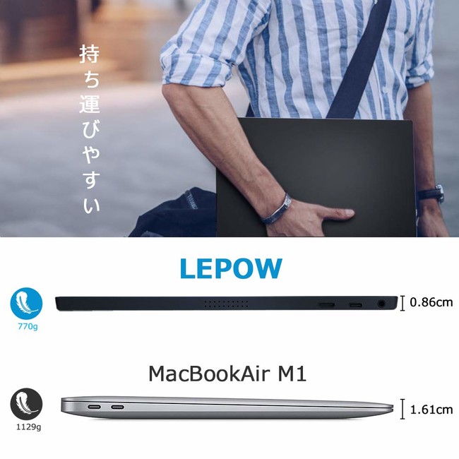 LEPOWポータブルモニターの厚みは約9mm、重量は僅か770gで、軽量コンパクトで、カバンに収納でき、持ち運びやすいです。出張や旅行の時でも、広い画面で作業できます。
