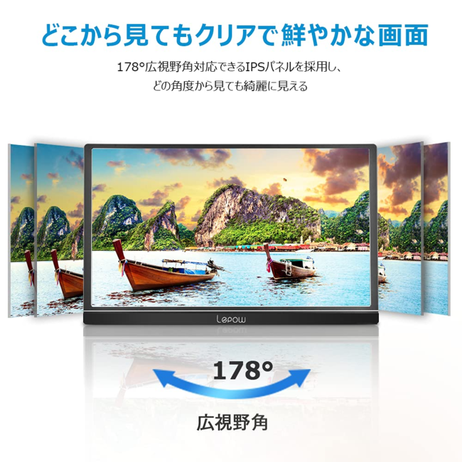 LEPOWポータブルモニターは可視性に優れたIPS液晶パネルを採用し、視野角度による輝度変化が少なく、最大178°の超広角を提供し、鮮明な画像や映像が表示できます。また、解像度は1920X1080でフルHDにも対応でき、NTSCカバー率は45.37%で、高画質な映像をいつでもお楽しめます。