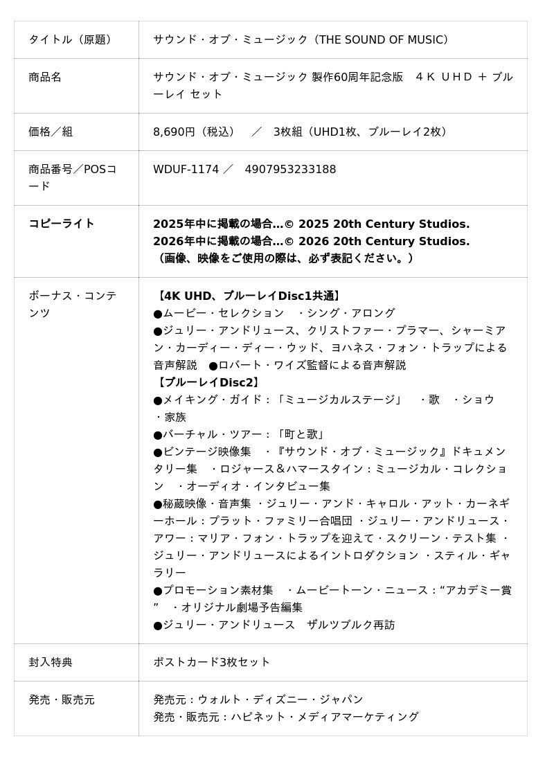 ウォルト・ディズニー・ジャパン株式会社(東京都港区)は、1965年に公開され、アカデミー賞(R)5部門を受賞したミュージカル映画の最高峰『サウンド・オブ・ミュージック』が2025年で製作60周年を迎えたことを記念し、2026年1月21日(水)に『サウンド・オブ・ミュージック 製作60周年記念版 4K UHD + ブルーレイ セット』を発売いたします!さらに、11月21日(金)より特別劇場公開も決定いたしました。