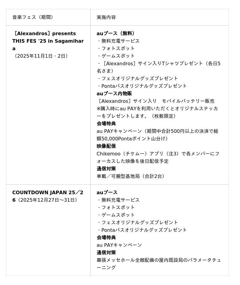 KDDIは、2025年11月実施の「[Alexandros]presents THIS FES '25 in Sagamihara」と2025年12月実施の「COUNTDOWN JAPAN 25/26」において、快適な音楽フェスをサポートする「auフェスプロジェクト」を実施することをお知らせします。