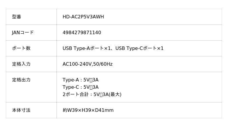 USB Type-Cポートを2つ搭載したAC充電器です。