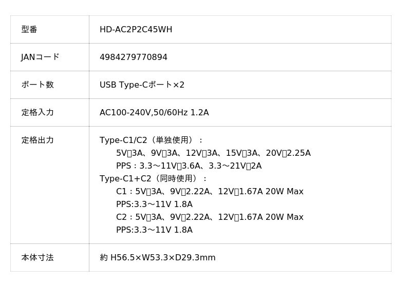 合計最大45Wの出力が可能であり、またPPS(Programmable Power Supply)に対応しているため、接続した機器をスピーディかつ効率よく充電できます。