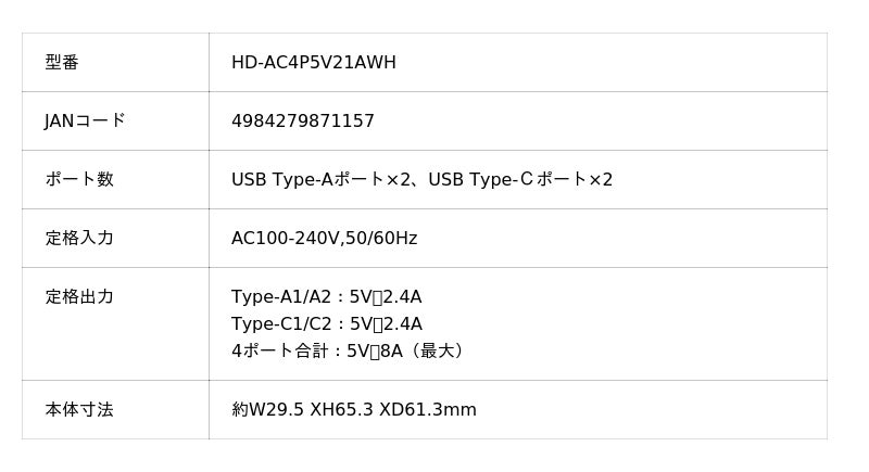 合計最大出力は8Aで、最大4台の機器を同時に充電することができます。