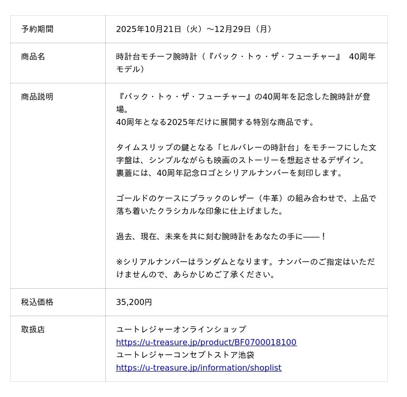 株式会社ユートレジャー(本社:東京都新宿区、代表取締役社長:青木 興一、株式会社ケイ・ウノの連結子会社)は、2025年で映画公開から40周年を迎えた『バック・トゥ・ザ・フューチャー』とコラボレーションした「時計台モチーフ腕時計(『バック・トゥ・ザ・フューチャー』 40周年モデル)」を2025年10月21日(火)〜12月29日(月)の期間限定で予約受付を行います。ユートレジャーオンラインショップ、ユートレジャーコンセプトストア池袋にて取り扱います。