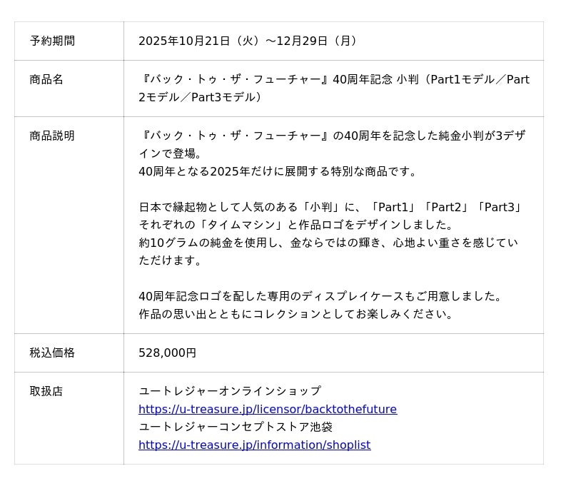 株式会社ユートレジャー(本社:東京都新宿区、代表取締役社長:青木 興一、株式会社ケイ・ウノの連結子会社)は、2025年で映画公開から40周年を迎えた『バック・トゥ・ザ・フューチャー』とコラボレーションした「『バック・トゥ・ザ・フューチャー』40周年記念 小判」を2025年10月21日(火)〜12月29日(月)の期間限定で予約受付を行います。ユートレジャーオンラインショップ、ユートレジャーコンセプトストア池袋にて取り扱います。