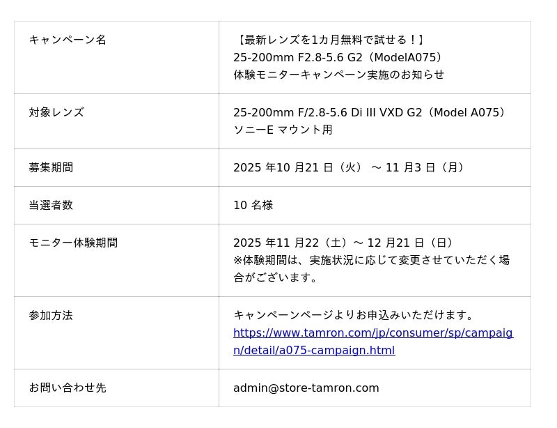 総合光学機器メーカーの株式会社タムロン(本社:さいたま市)は、フルサイズミラーレス一眼カメラ対応ソニー E マウント用高倍率ズームレンズ「25-200mm F/2.8-5.6 Di III VXD G2(Model A075)」の発売を記念して、体験モニターキャンペーンを実施いたします。