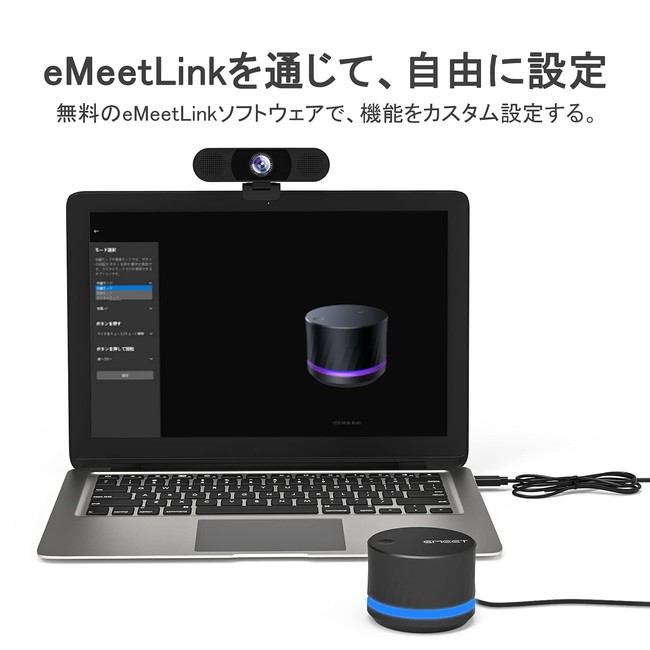 無料のeMeetLinkソフトウェアで、機能をカスタム設定する。会議、音楽、カスタムモードを切り替えたり、ボタンやLEDライト効果を調整したりできる。eMeetLinkソフトウェアをインストールした後、プラグアンドプレイで、デバイスに接続すると使用できる。