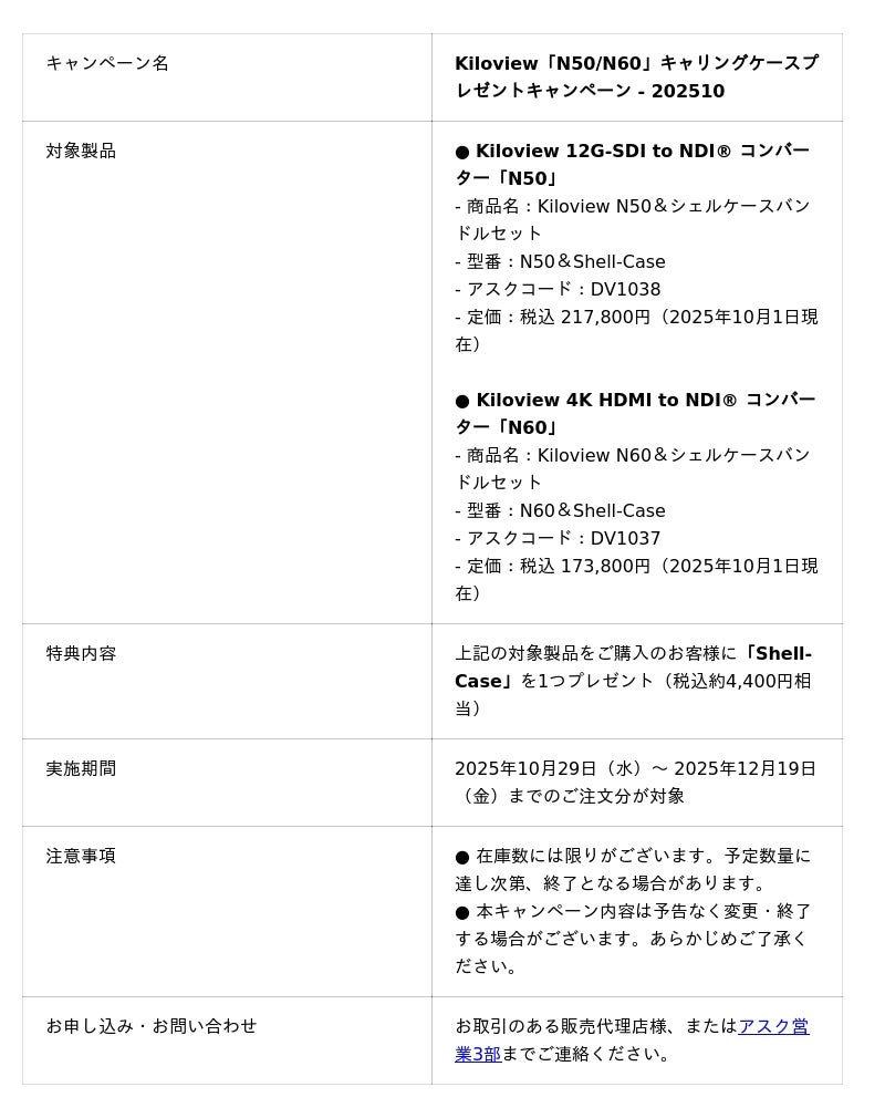 株式会社アスク(本社:東京都千代田区)は、Kiloview社のフラッグシップNDI(R)コンバーター「N50」「N60」を対象に、キャリングケース「Shell-Case」をプレゼントする特別キャンペーン【Kiloview「N50/N60」キャリングケースプレゼントキャンペーン - 202510】を実施いたします。