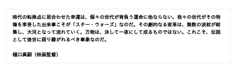 さらに、本書は『スター・ウォーズ』の映画が公開されていない時期の出来事も詳細に網羅しています。ひとつのストーリーラインに沿った拡張世界と呼ばれるスピンオフ物語や小説、『スター・ウォーズ』に影響を与えた、あるいは影響を受けたコミックや音楽、映画ポスター。そして現在も拡大を続けるマーチャンダイジングまで、読み応え抜群の内容です。