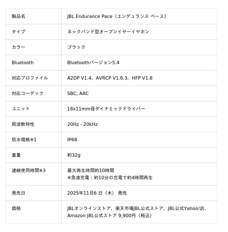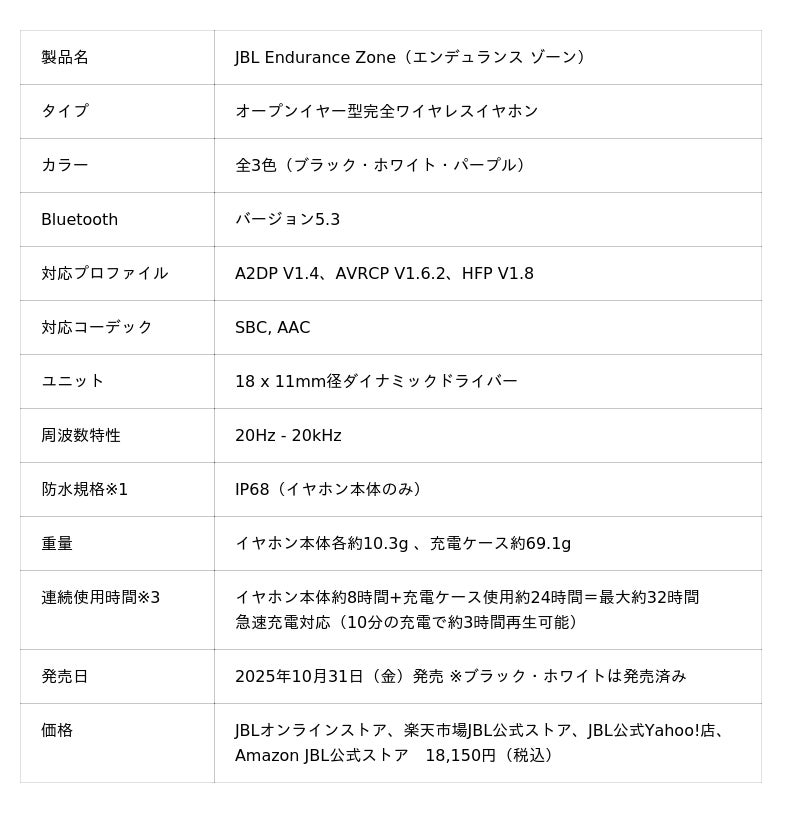 さらに、スポーツイヤホンシリーズに新しく登場するネックバンド型オープンイヤーイヤホン「JBL Endurance Pace(エンデュランス ペース)」を2025年11月6日(木)よりJBLオンラインストア、楽天市場JBL公式ストア、JBL公式Yahoo!店およびAmazon JBL公式ストアにて限定発売。そして、9月に登場したオープンイヤー型完全ワイヤレスイヤホン「JBL Endurance Zone(エンデュランス ゾーン)」に新色のパープルが加わり、2025年10月31日(金)より発売開始いたします。