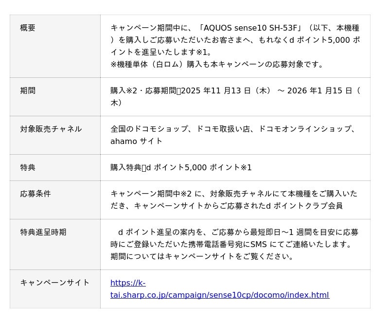 なお、「AQUOS sense10 SH-53F」発売に併せたキャンペーンを開催いたします。キャンペーンの詳細は別紙をご確認ください。